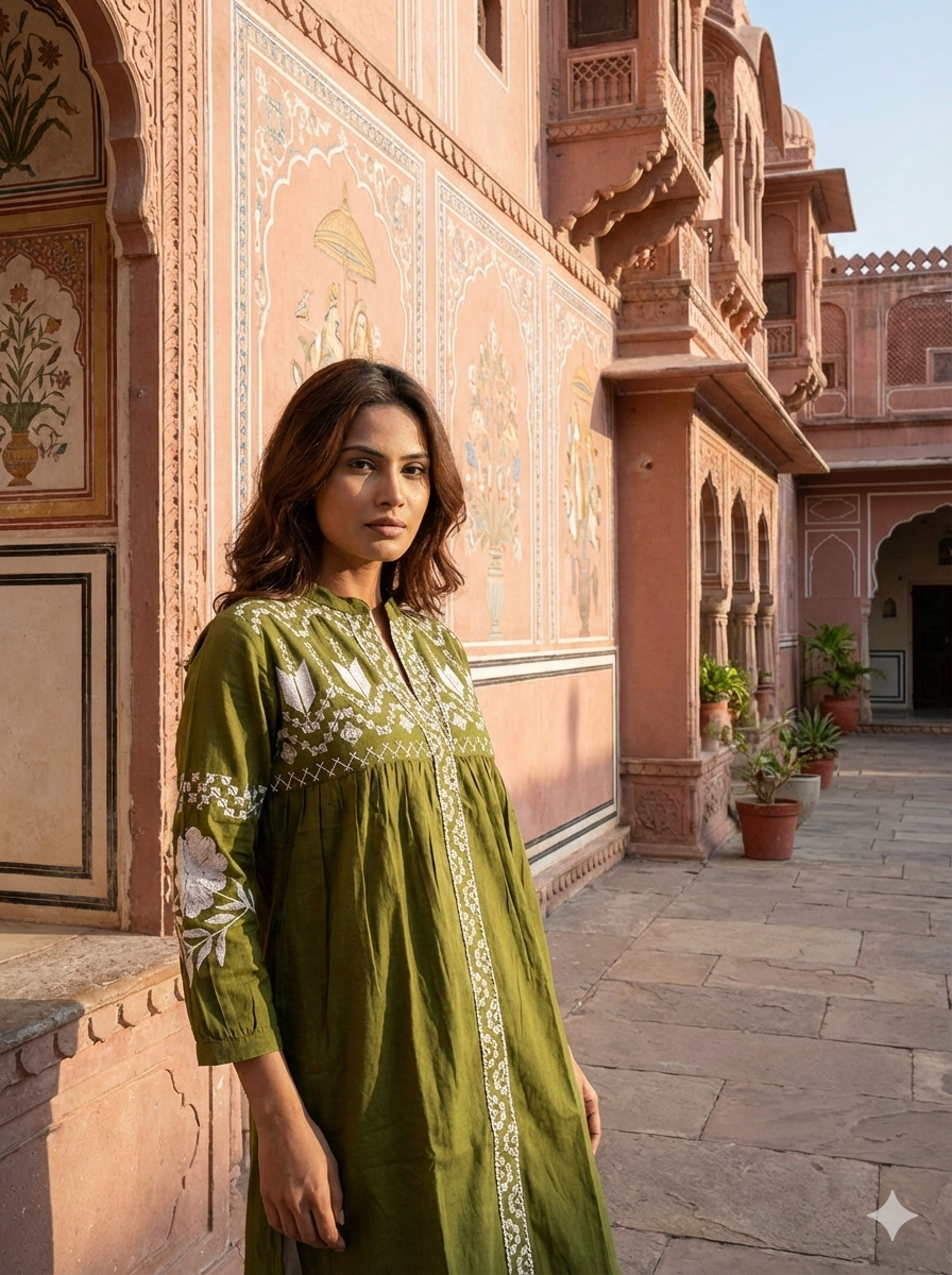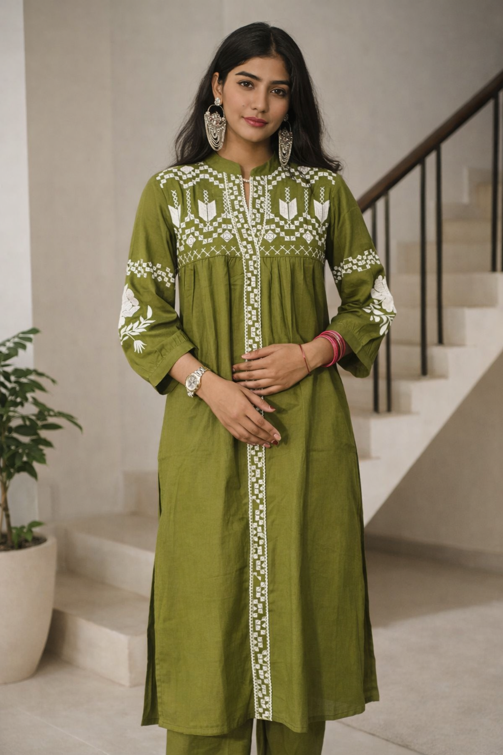 Rooted in tradition and designed for everyday comfort, this olive green cotton kurti features intricate white handblock-inspired prints across the yoke and sleeves. The relaxed silhouette and breathable fabric make it perfect for long workdays or casual outings. Subtle yet striking, it’s a timeless piece that brings understated elegance to your ethnic wardrobe.