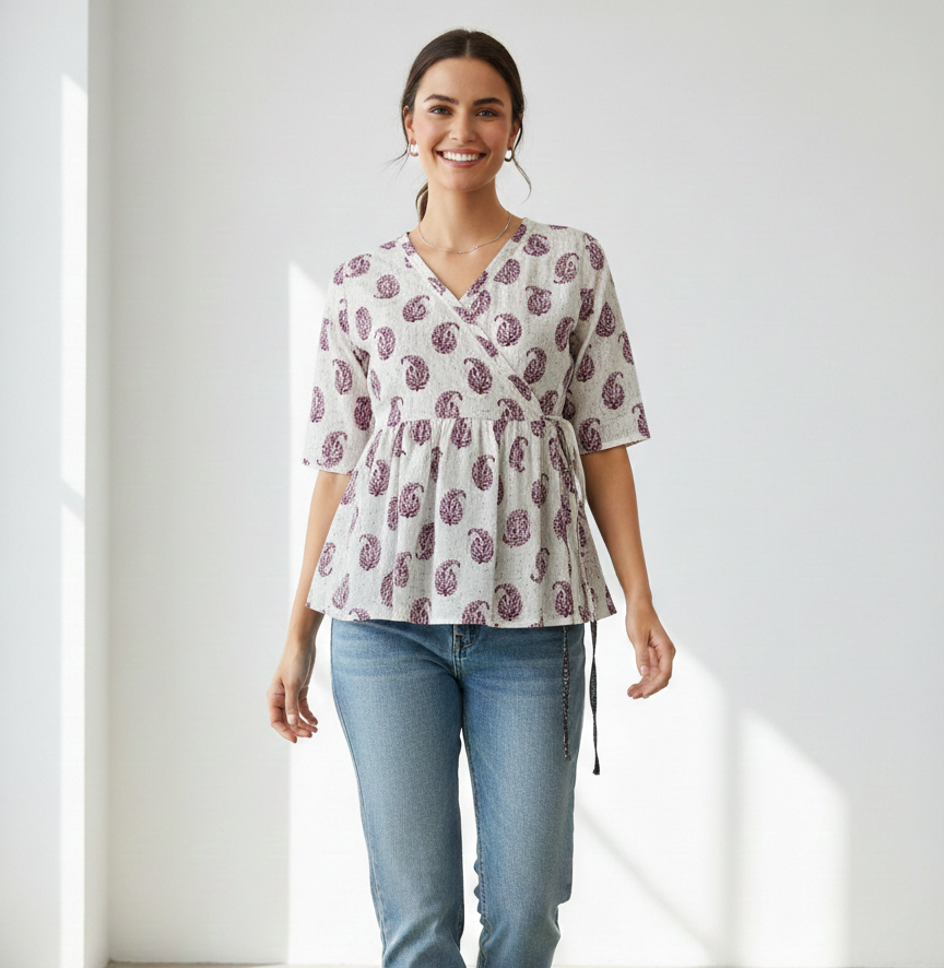 This printed wrap-style kurti is designed for effortless everyday elegance. Featuring a flattering V-neck wrap design and a softly gathered waist, it creates a graceful silhouette that suits all body types. The delicate all-over print adds a subtle ethnic touch, making it perfect for women who love comfort with understated style.